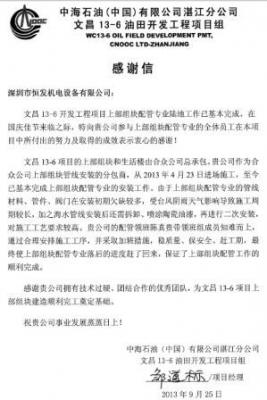 2013年中海油湛江分公司文昌項(xiàng)目感謝